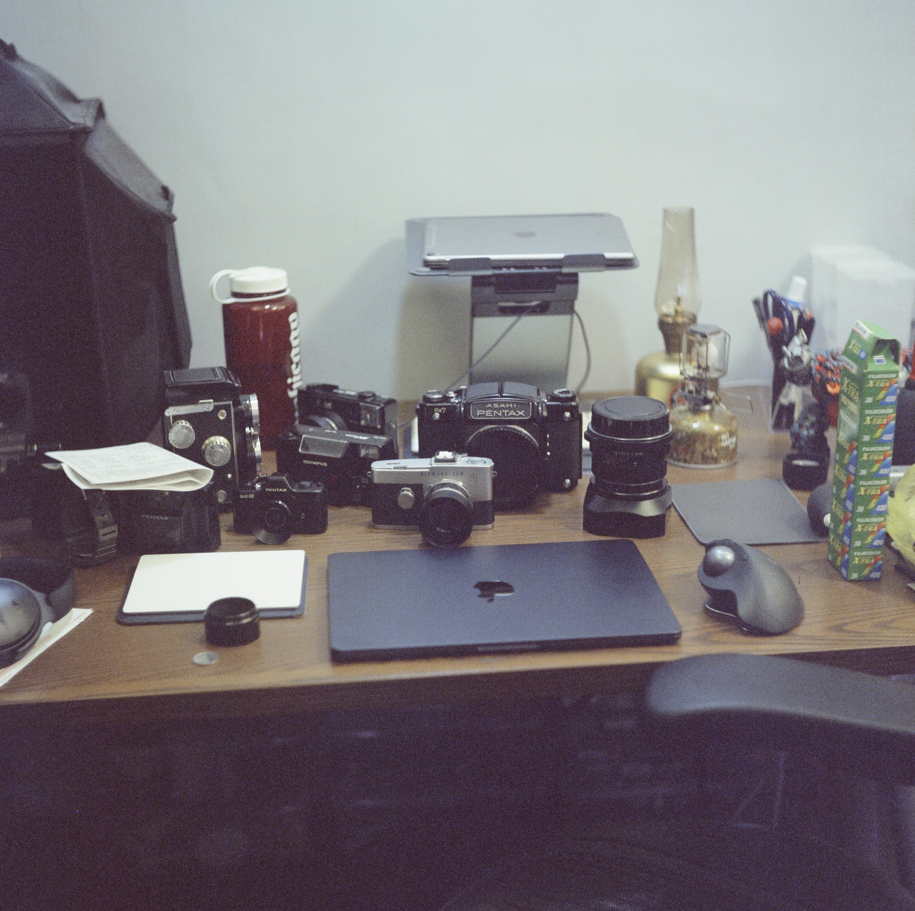 當時的工作桌,被相機淹沒中,因為我正在努力思考到底去日本東京,要帶哪些相機。