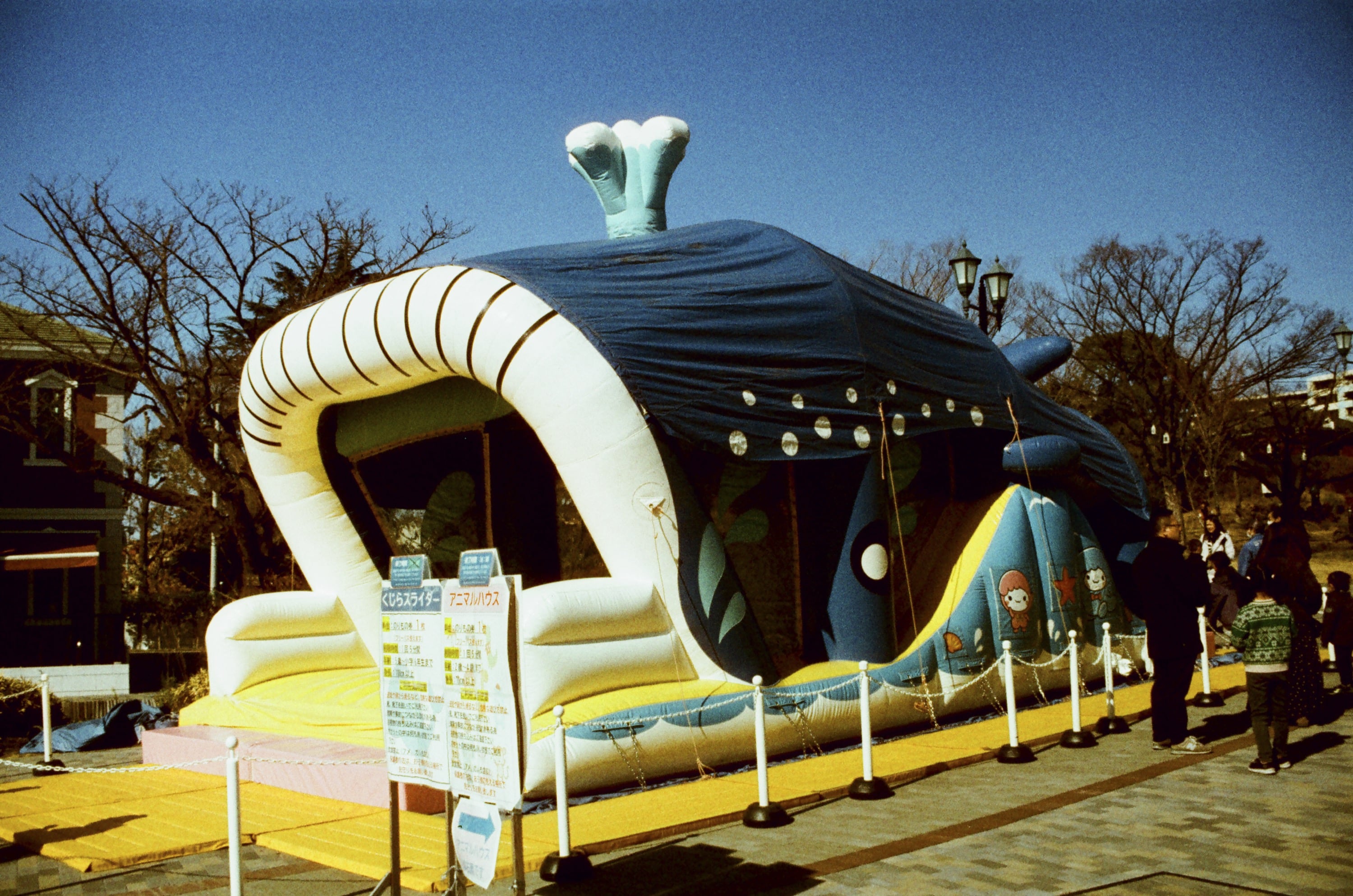 這個遊樂設施是一個大鯨魚充氣溜滑梯。
