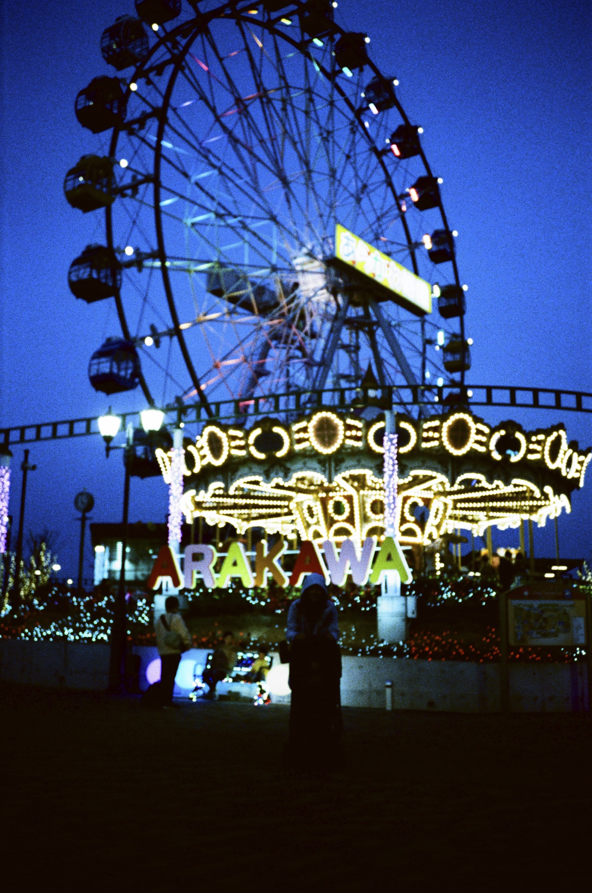 離開前,我們跟荒川遊樂園的照片合了影。有點想用 Lightroom 救這張的暗部,但想想還是算了,都拍底片了,何必在意那麼多細節問題呢?反正底片本來就是要充滿不確定性才迷人。