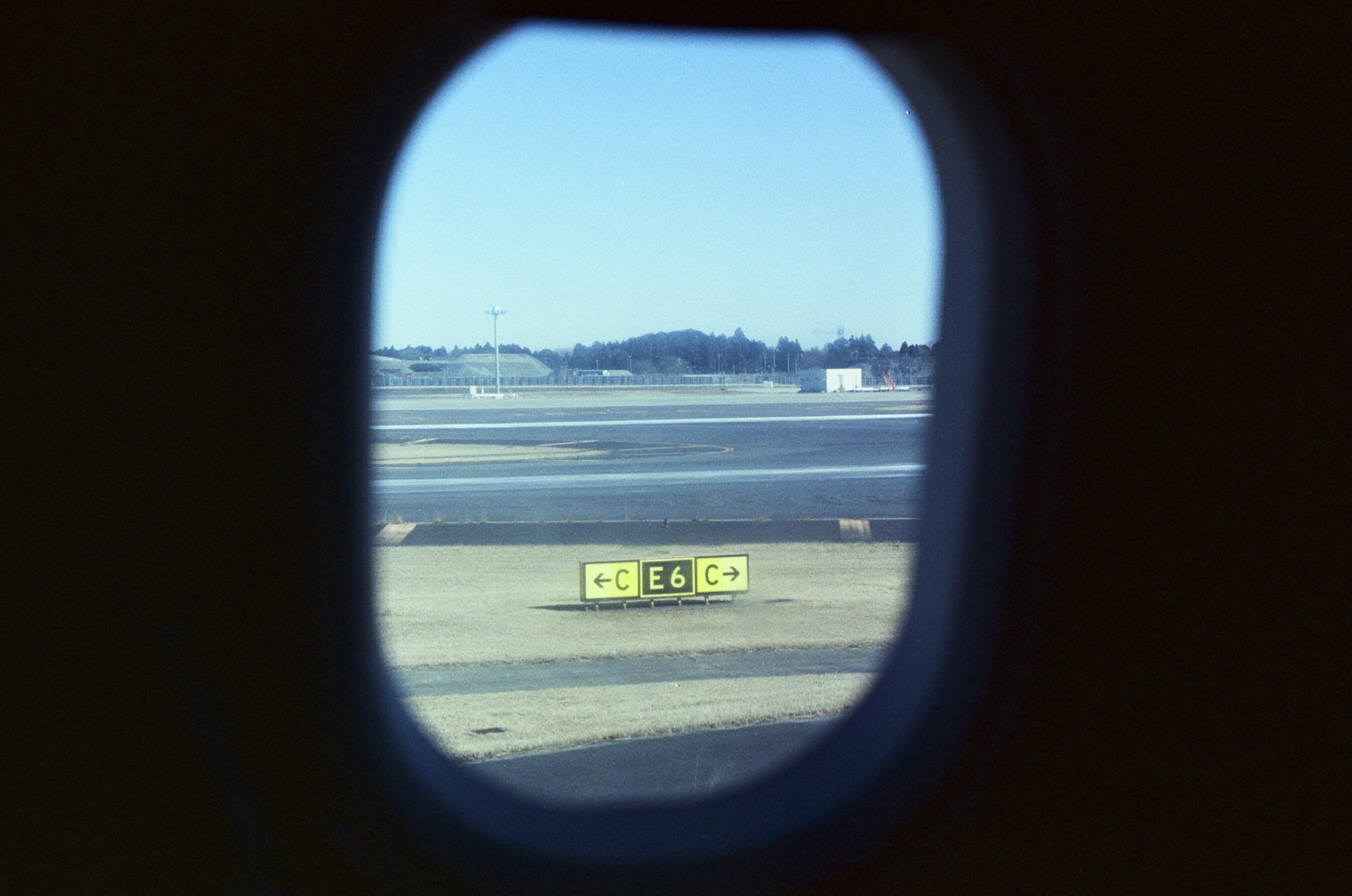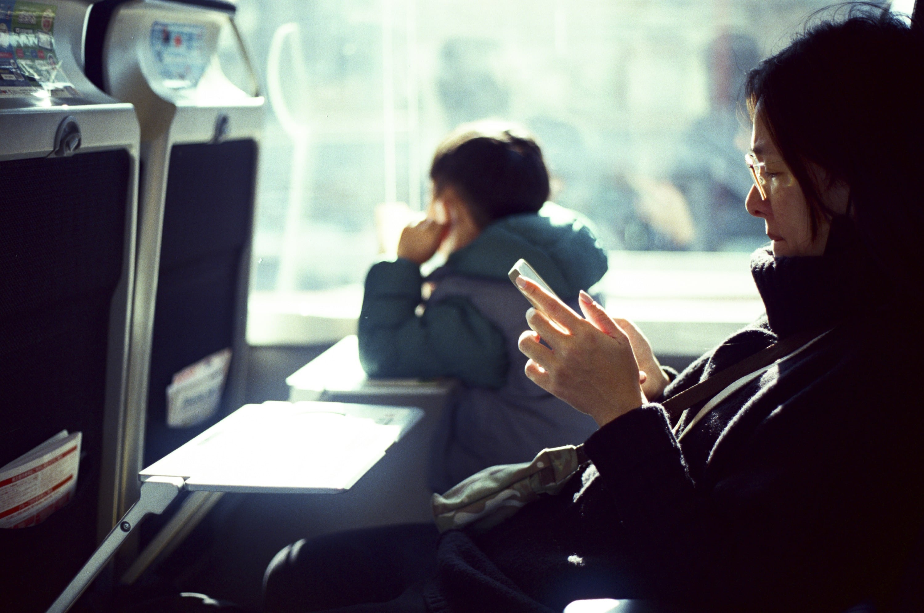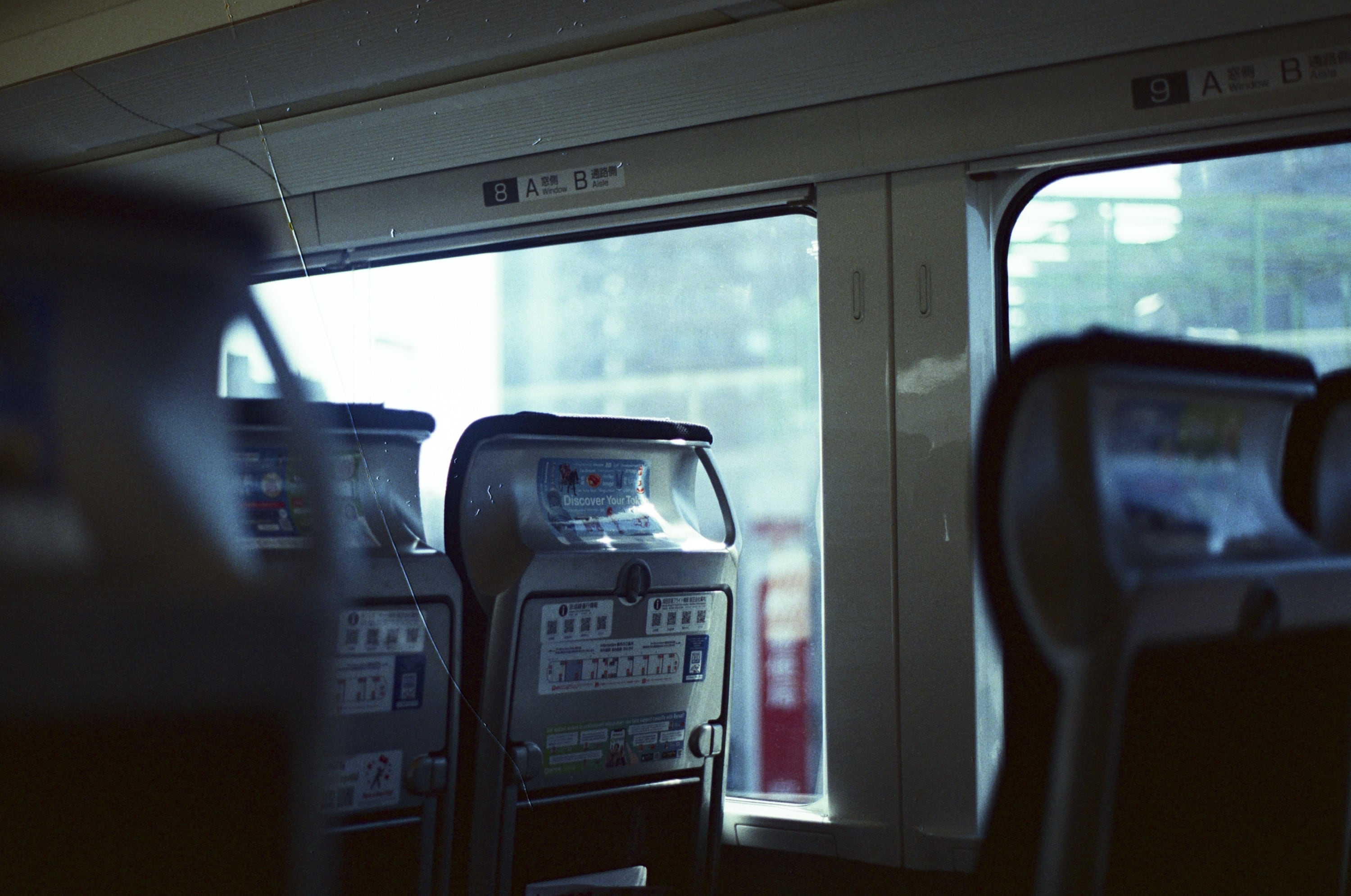 題外話,這卷電影底片是在新北樹林東榤(揚禾)沖掃的,他們家的除碳真的是我碰過殘留最多的,沒有之一。如果是以 135 電影底片的話,個人目前還是推薦彰化大村的金影攝影,不過真希望金影可以加價升級 Print File 無酸片袋。這張照片是我們還在前往機場的電車上,因為電車搭得有點久,所以我就隨意拍攝。