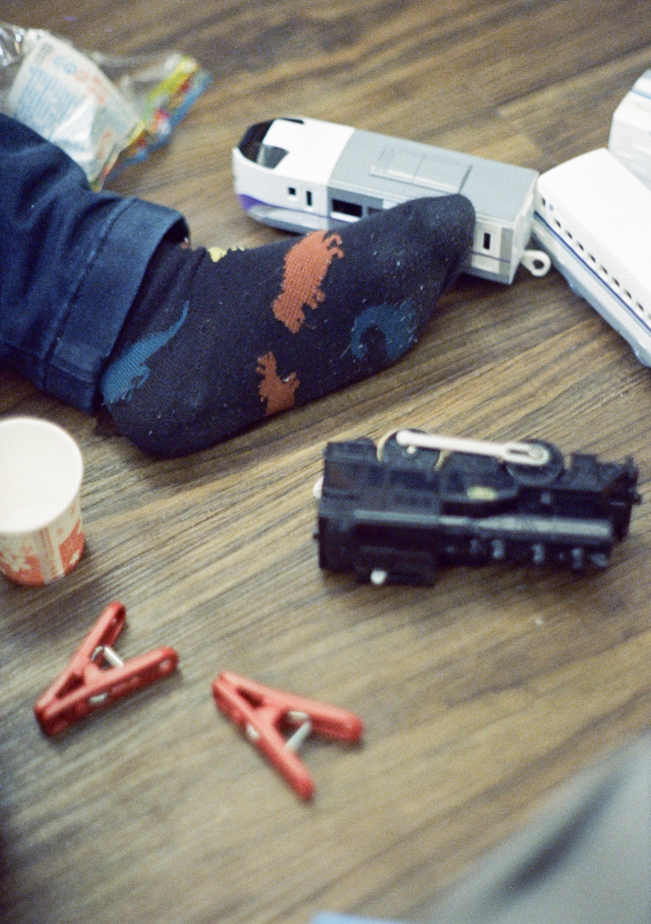 以 Tomy 小火車當比例尺,看兒子的腳目前有多大。