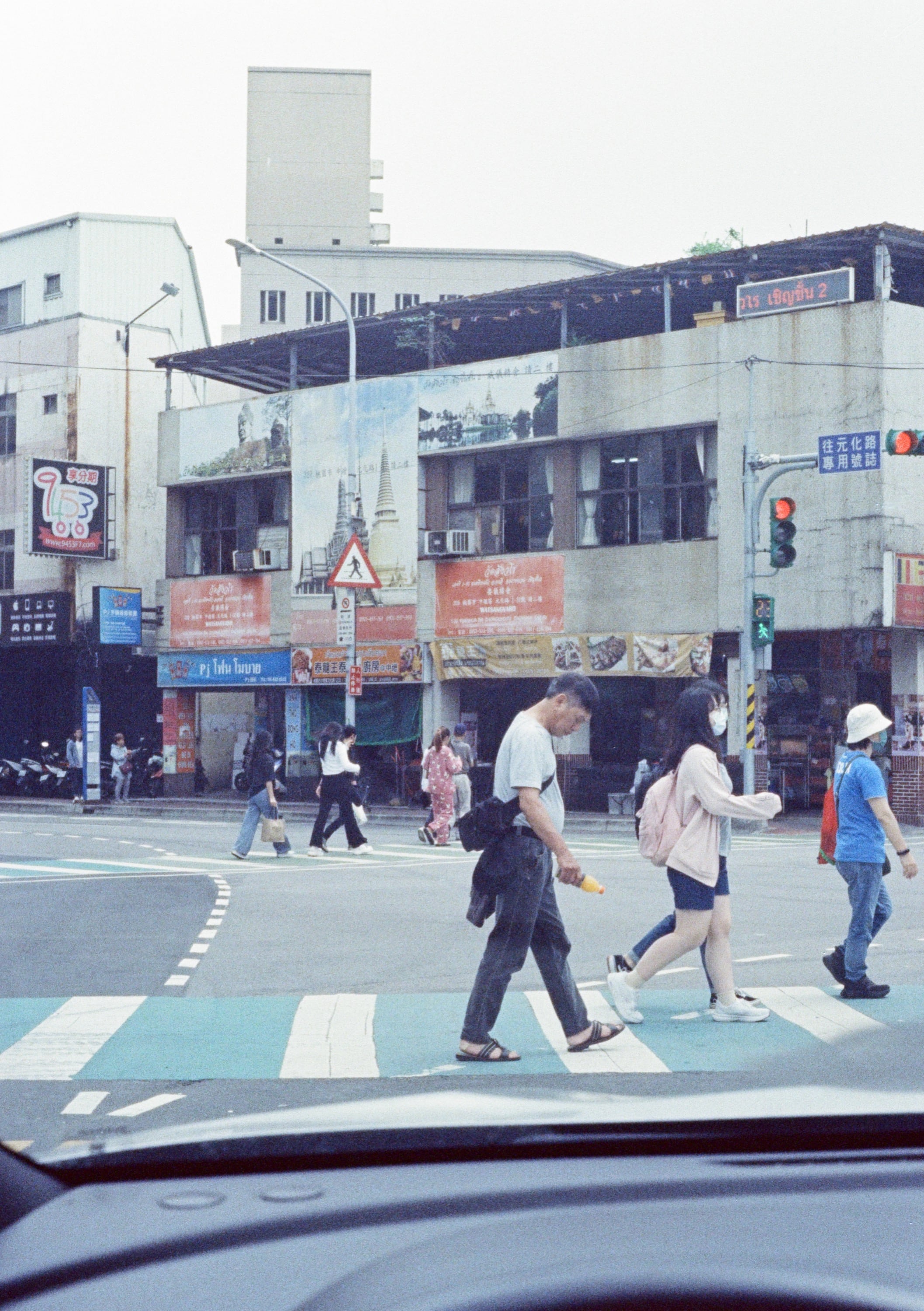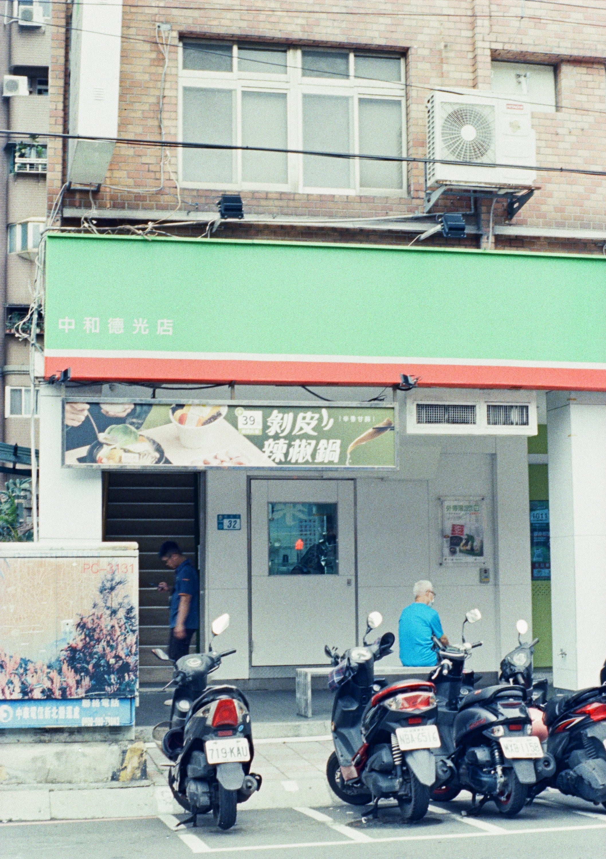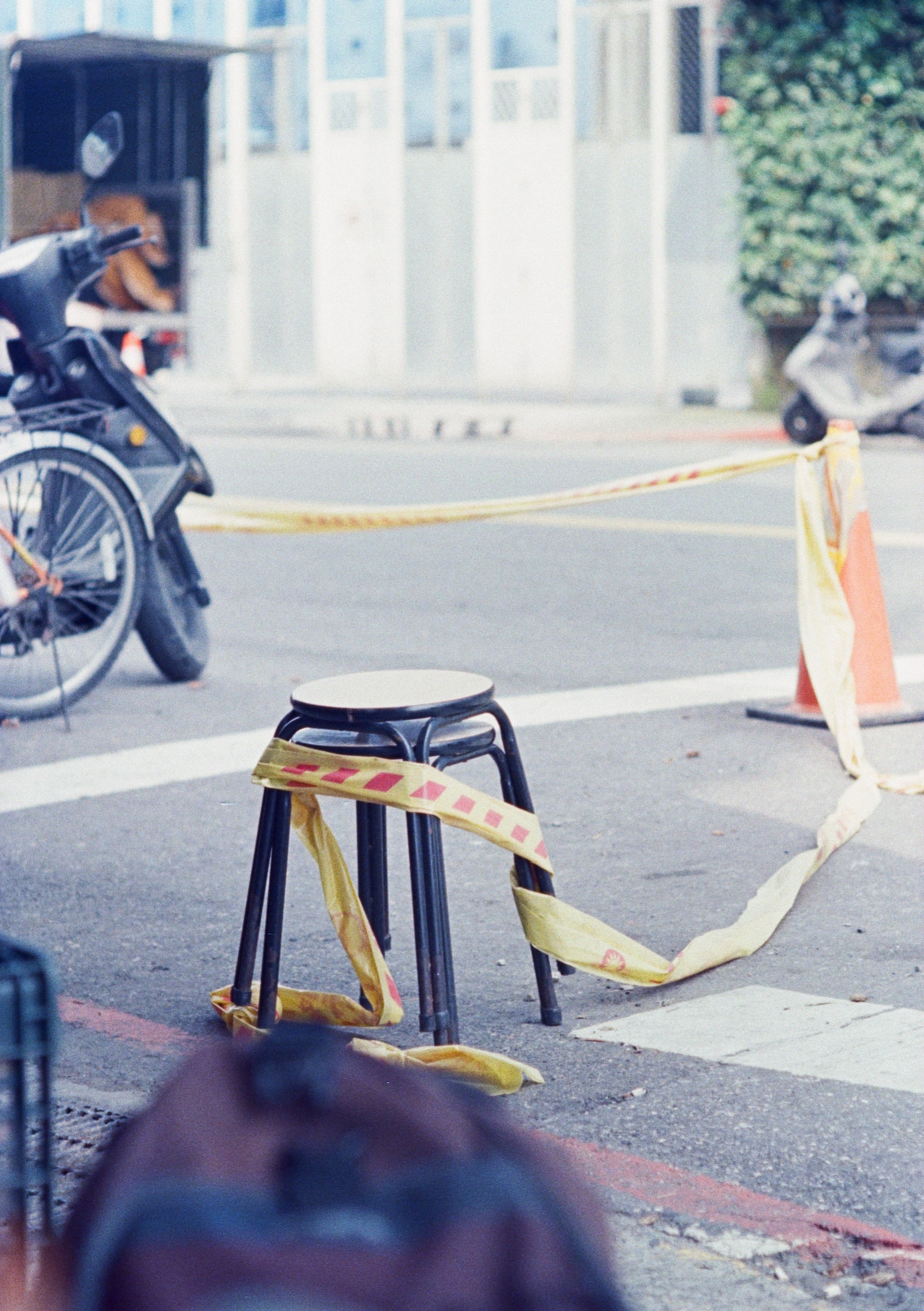 目前柯達電影底片,如果是以燈光片來說,就 Kodak Vision3 200T/5213 和 500T/5219 兩種,我發現自己是比較喜歡 200T 的顏色,它在日光下的顏色豐富度會比 500T 來得更好。這張照片是有次和家人在路邊吃飯拍的,當時附近正在施工,所以簡單用椅子圍成了封鎖線。