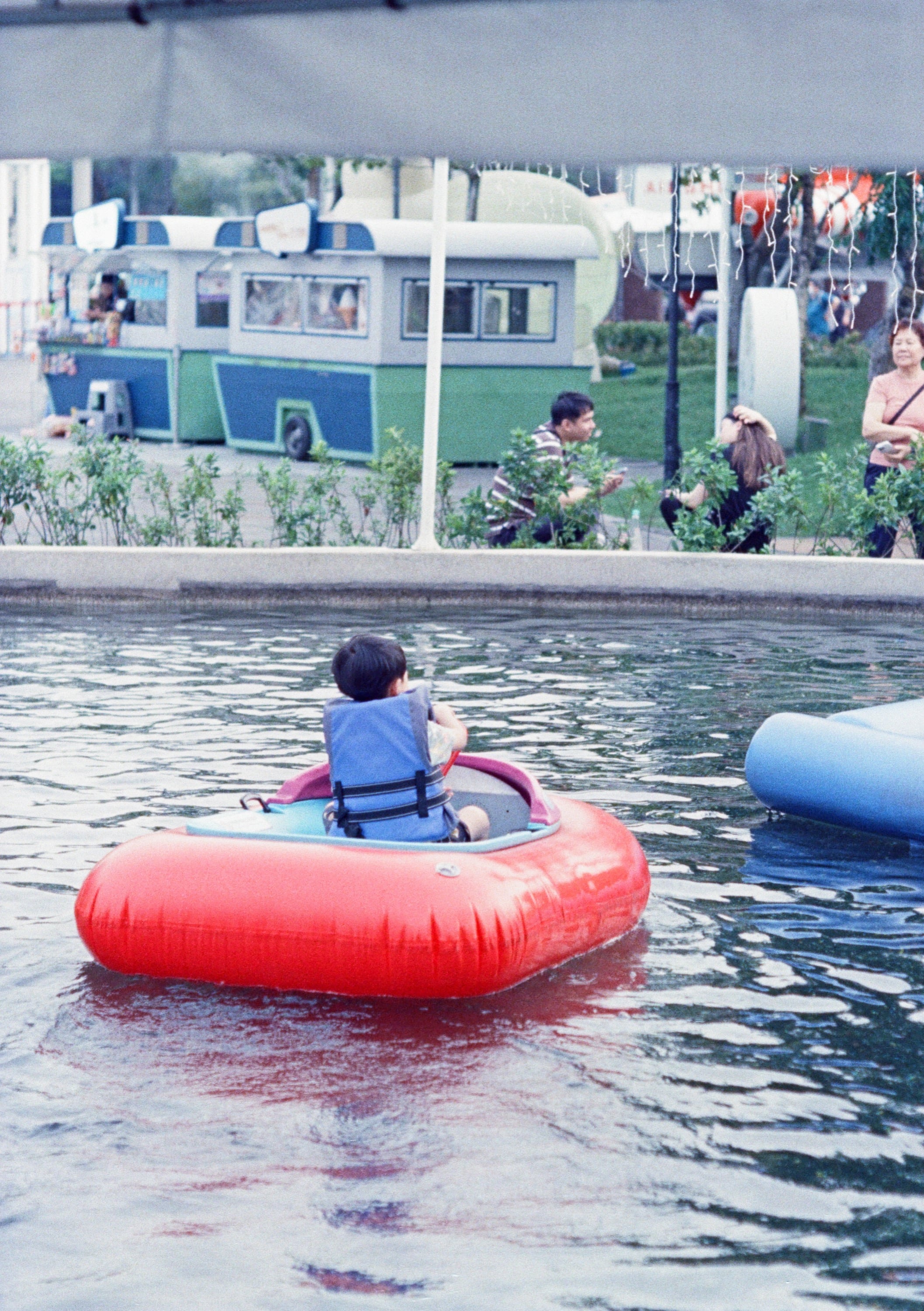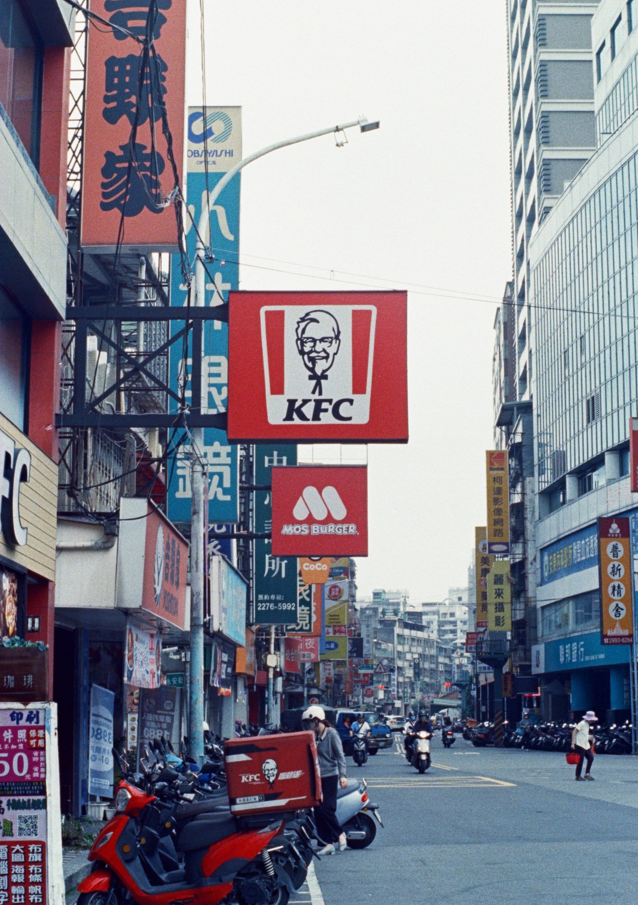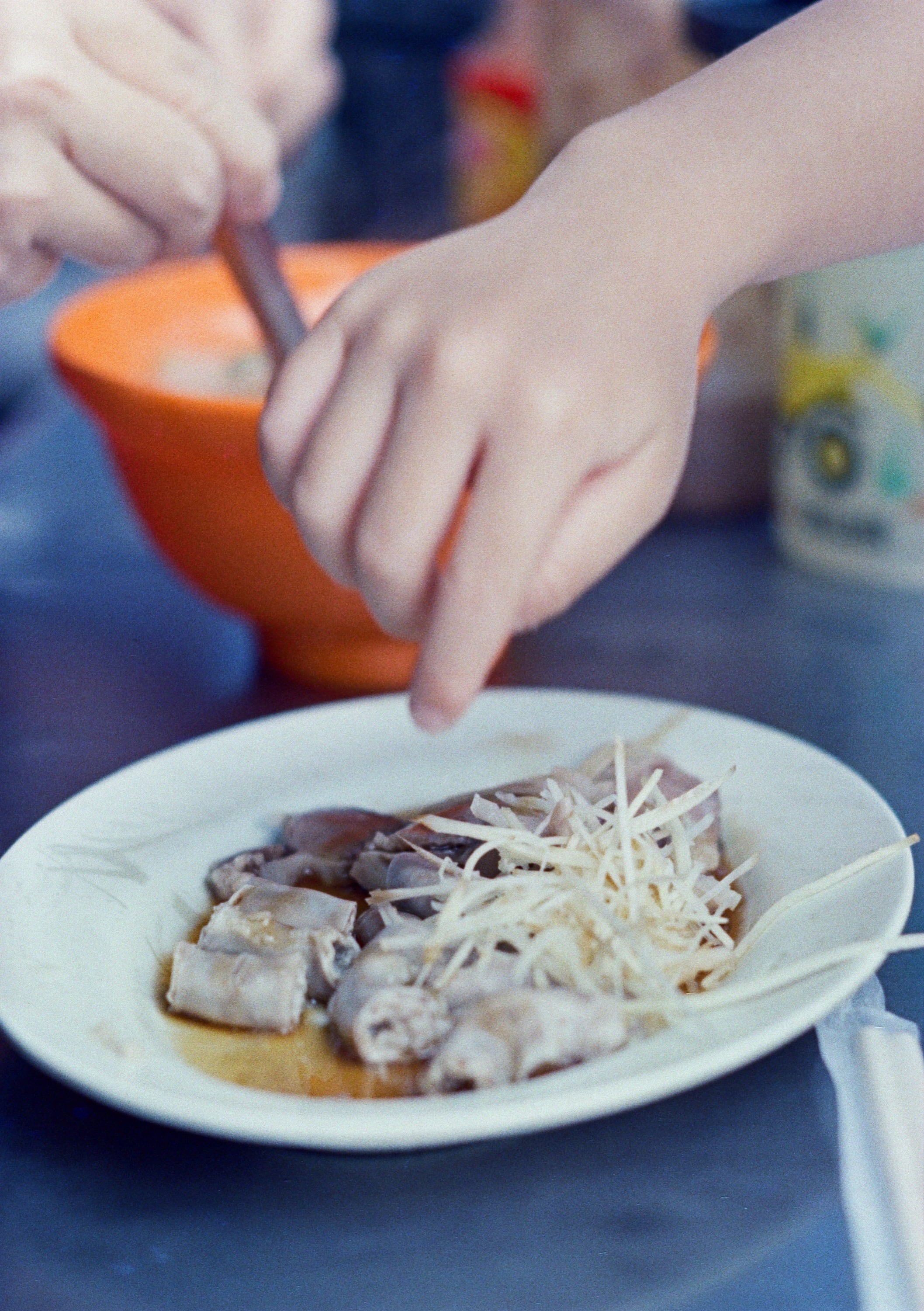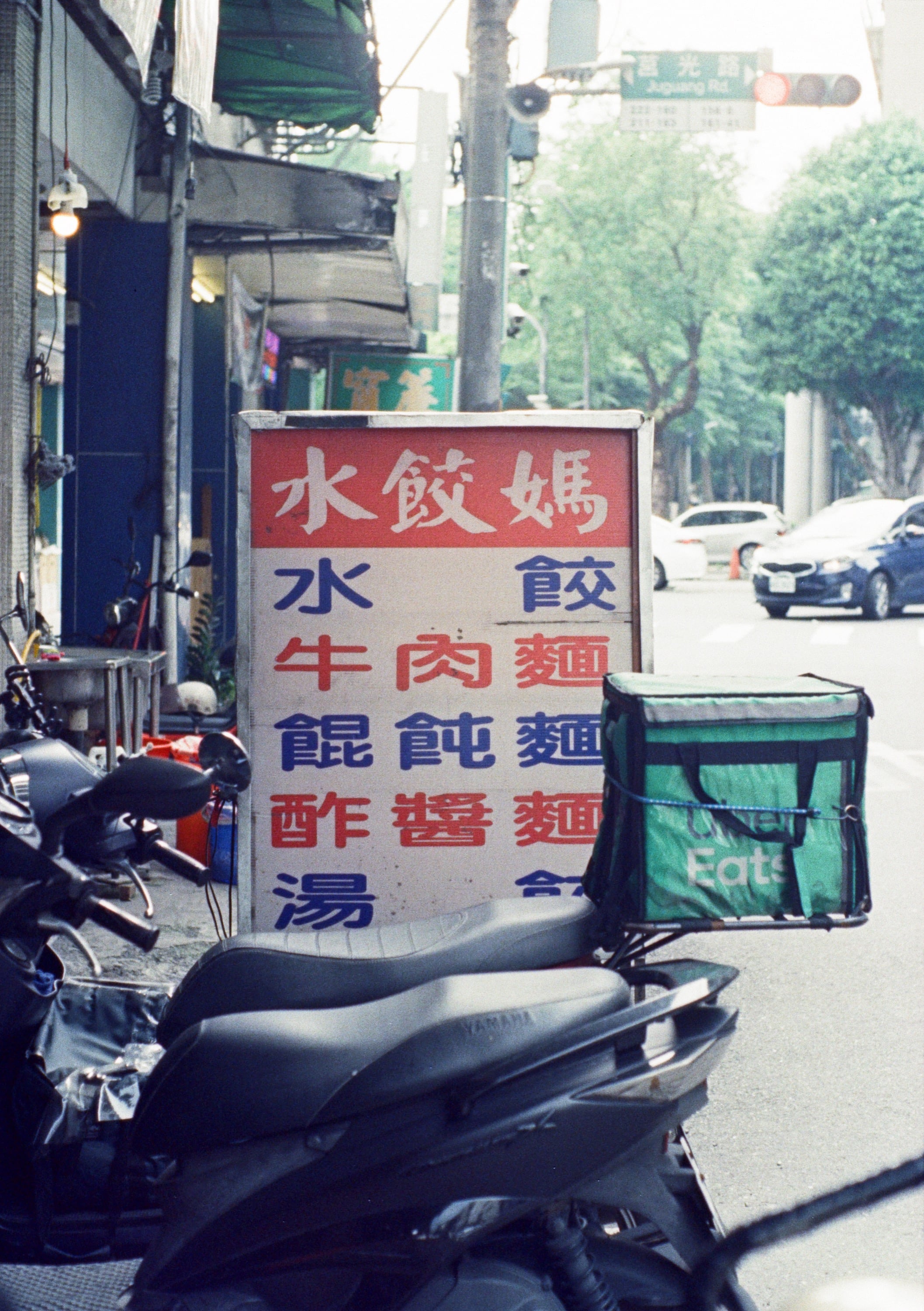 目前柯達電影底片,如果是以燈光片來說,就 Kodak Vision3 200T/5213 和 500T/5219 兩種,我發現自己是比較喜歡 200T 的顏色,它在日光下的顏色豐富度會比 500T 來得更好。這張照片是有次和家人在路邊吃飯拍的,當時附近正在施工,所以簡單用椅子圍成了封鎖線。
