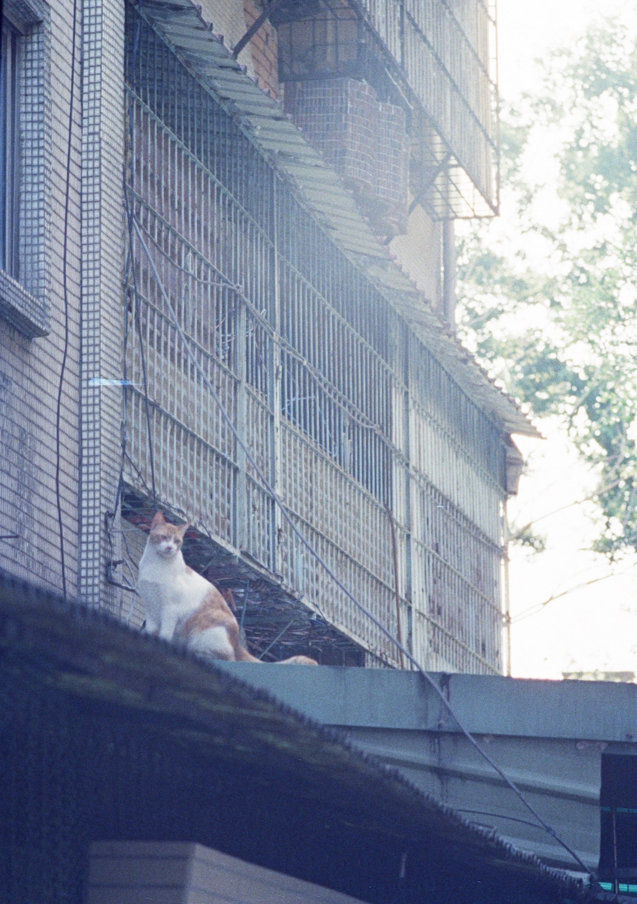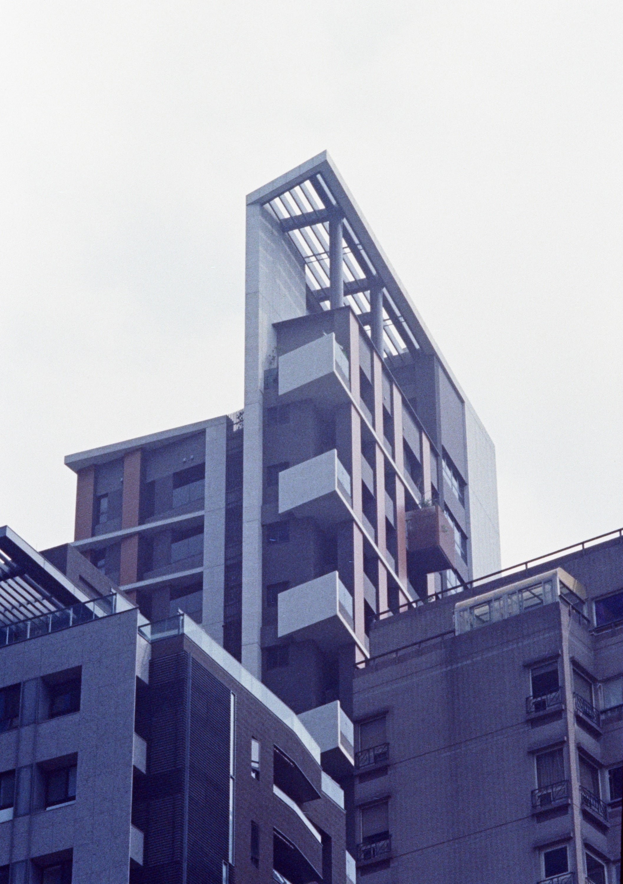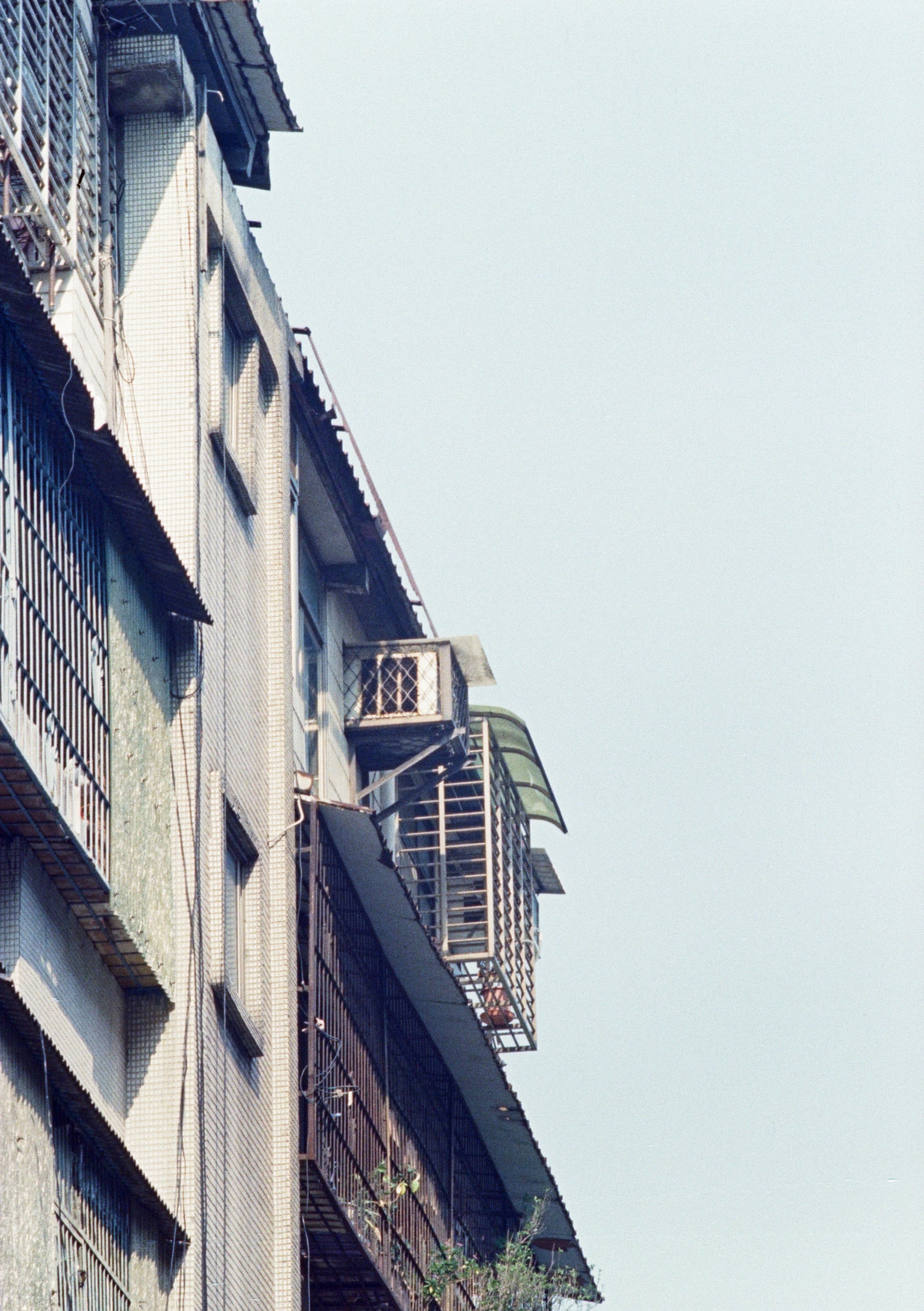 不同底片拍久了,可以單看畫面,大概猜到它是什麼底片,我覺得這種「讓自己慢慢變強」的過程很有樂趣。這張照片是我家附近的傳統公寓,我們那區都是這個長相的房子,小片磁磚、鐵窗、陽台植物、各種雜物。