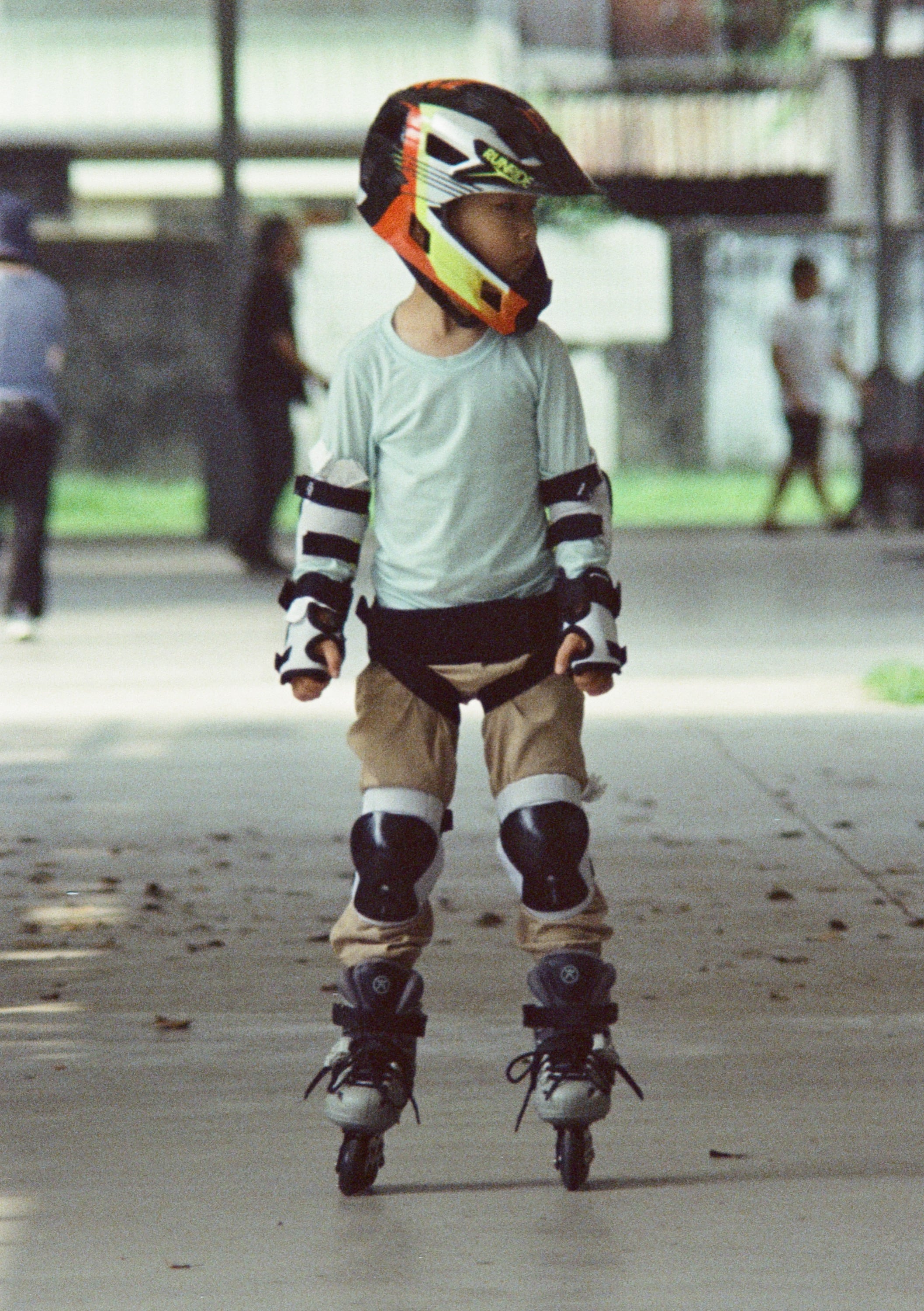 最近在練習直排輪的兒子,我們要求他要穿上全身護具才可以溜。