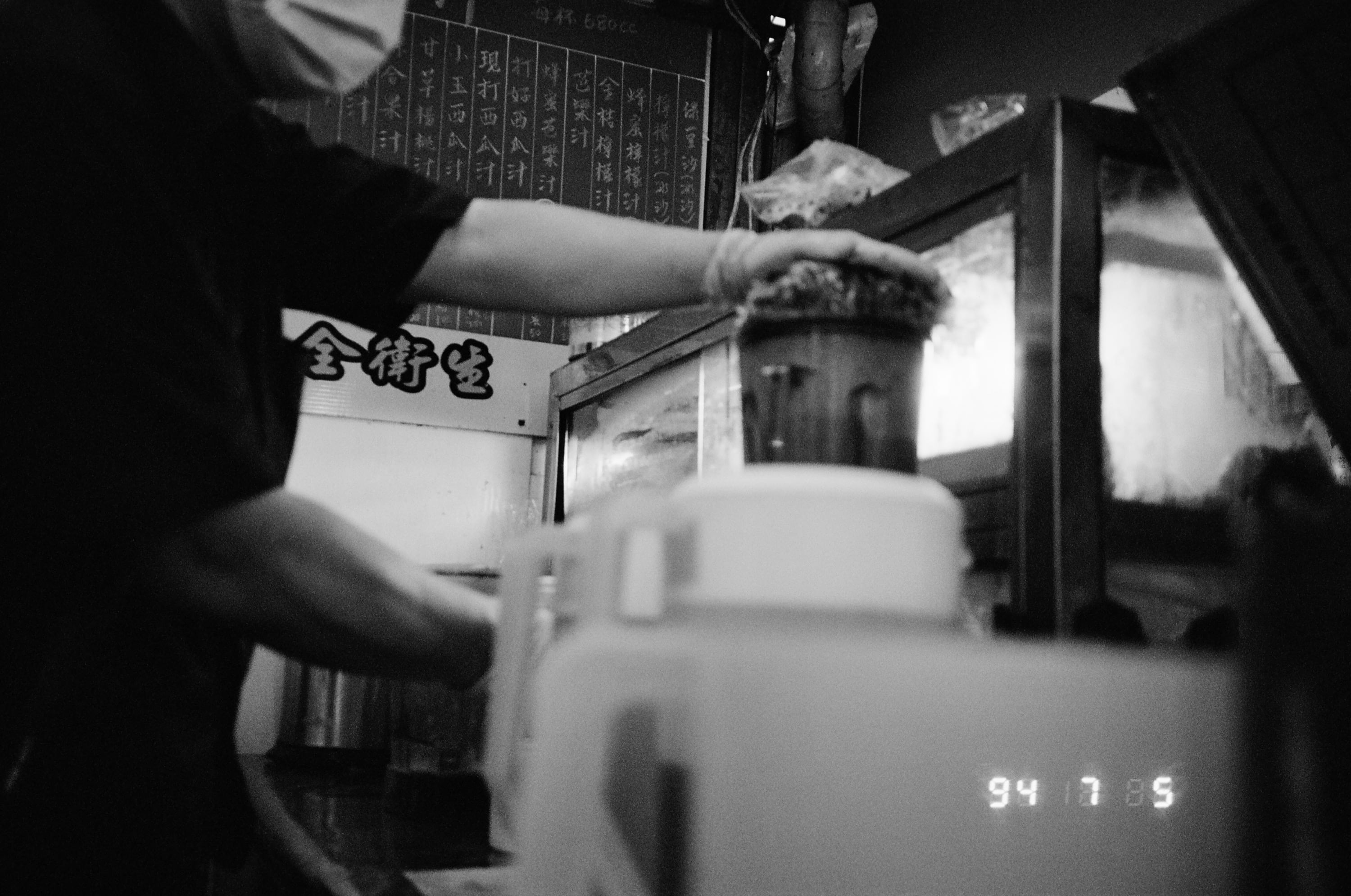 身高 112 公分的兒子,正在拍攝水果攤老闆用新鮮水果打果汁的樣子。