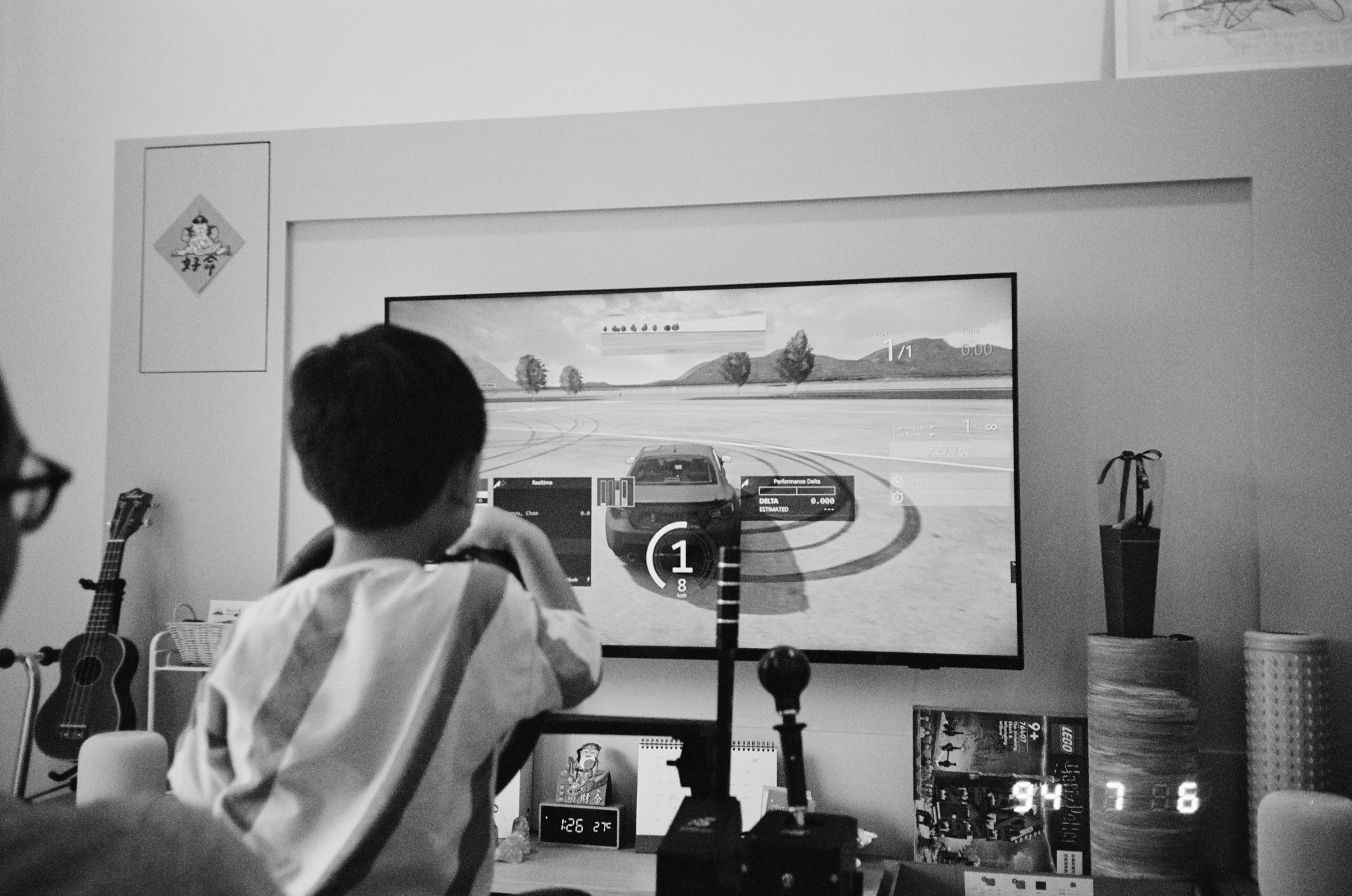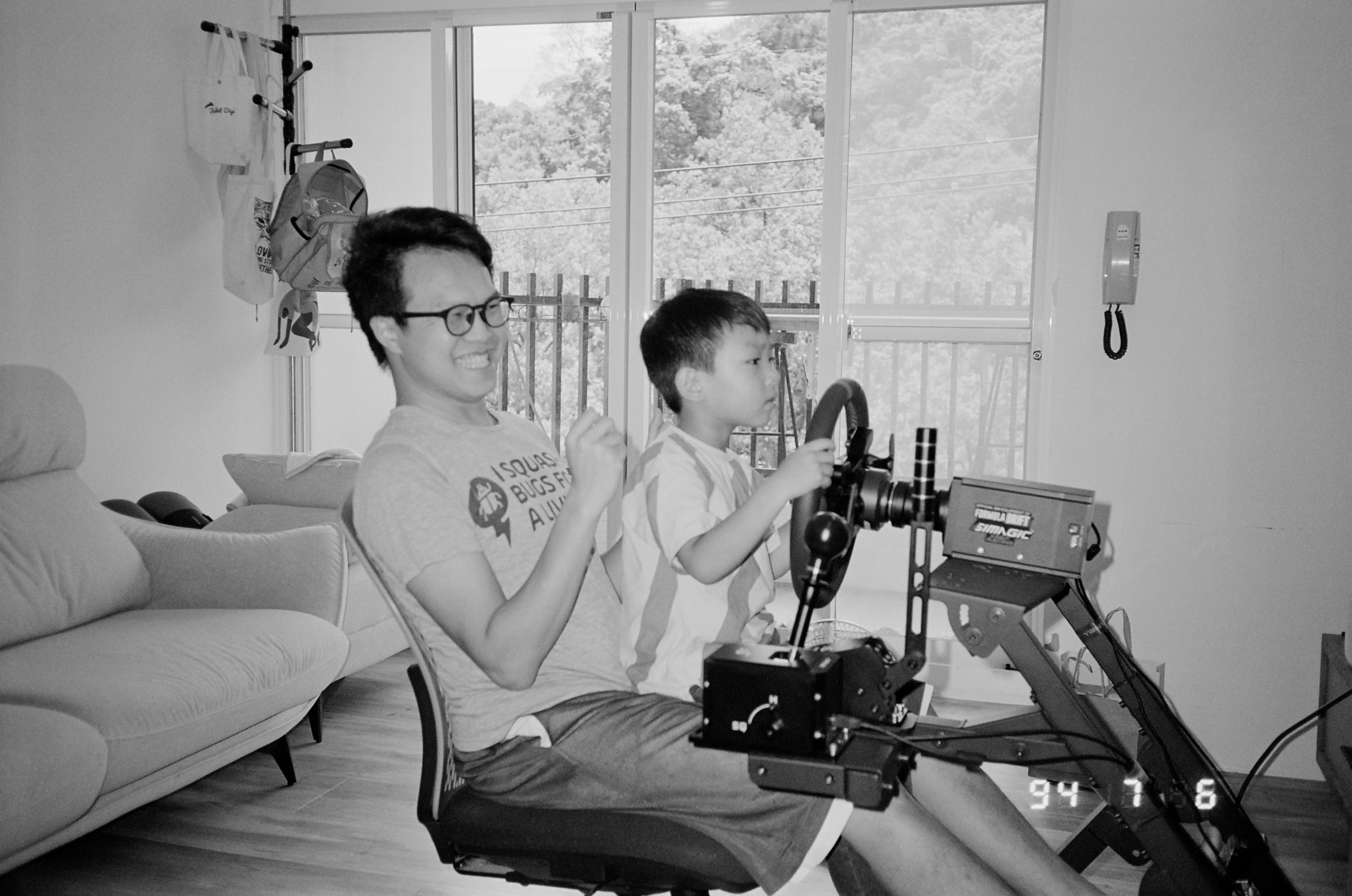 看著照片日期,這天是星期六,我原本應該要在家裡一打一帶小孩的,但我卻尋求外部支援,帶兒子去朋友家打電動。朋友家裡有物理等級的實感賽車,不過因為座椅是大人身高配置,小孩還踩不到踏板,因此需要讓小孩坐在大人腿上,由大人腳踩操控油門,而小孩則負責掌握方向盤。為此,我拍了這張情境照。兒子一開始是直接坐在我朋友的腿上,但他之後可能覺得怪怪的,於是之後要求要換我,因為兒子可能覺得還是坐在他爸的腿上比較自在。那天,我們在朋友家打了許多電動,簡單來說,就是開心樸實的一天!
