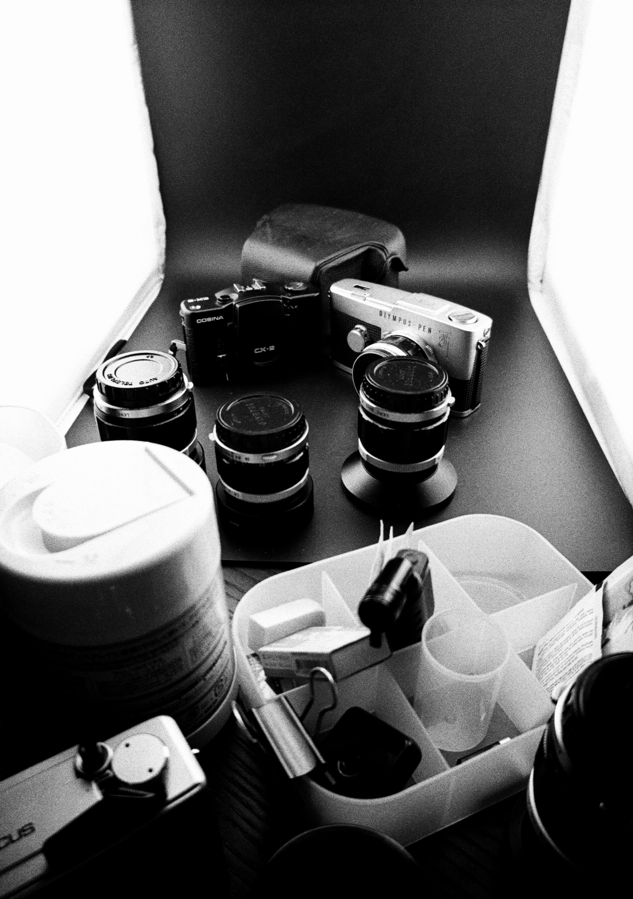 Cosina CX-2 和 Olympus Pen-F 初代,我不是刻意要讓它們合照,我只是桌子太亂沒地方放,所以就先放小攝影棚裡。