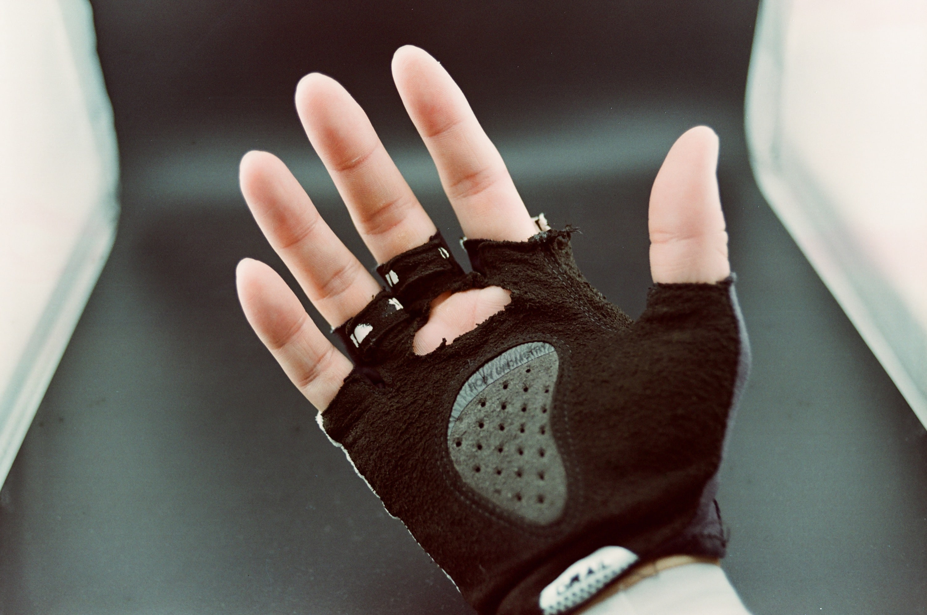 正在研究如果用左手拿相機拍下右手的照片,這張照片我非得用左手拍攝,因為我要拍這一隻已經破掉的右手自行車手套。