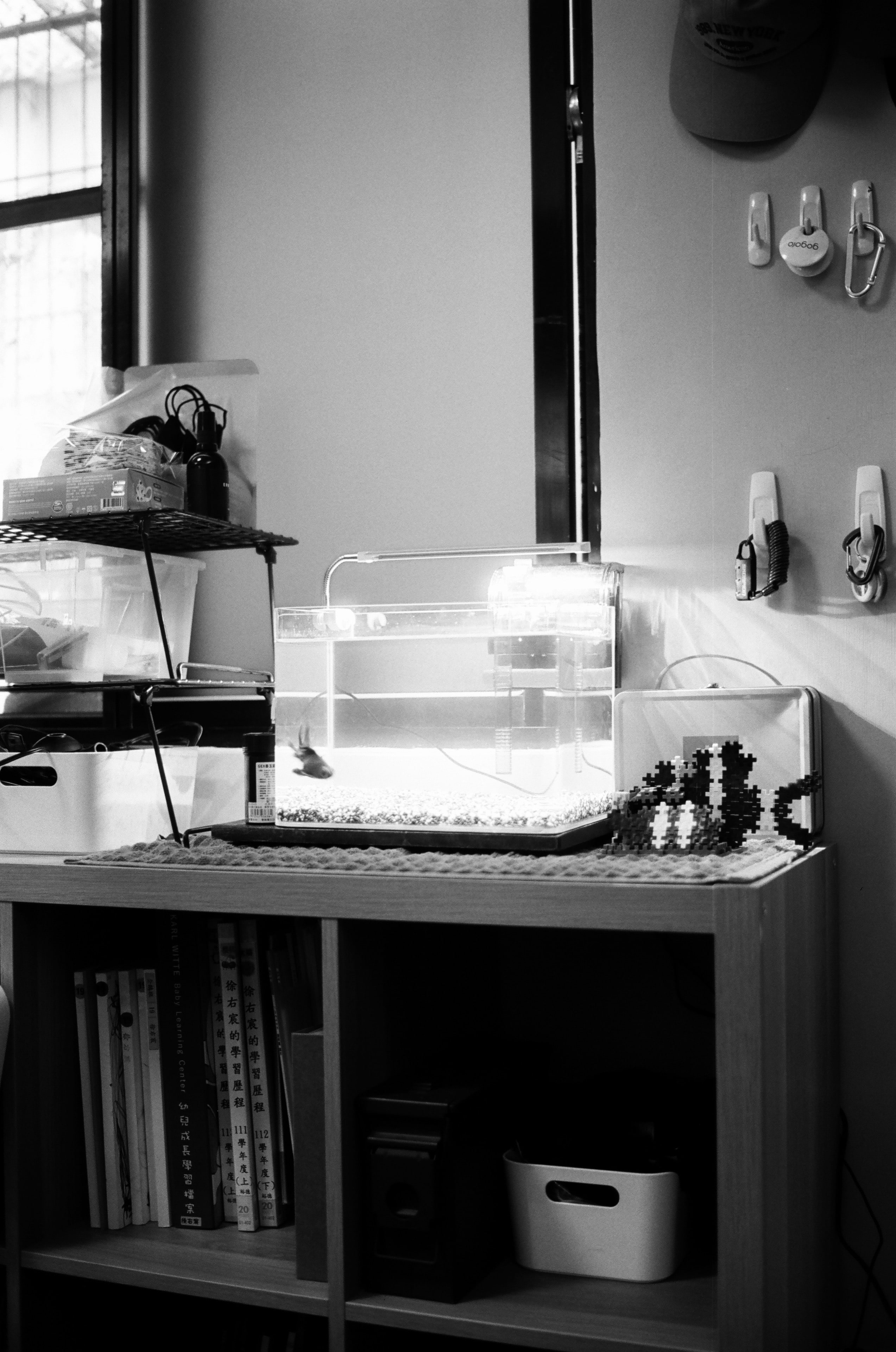 最近家裡養了一隻魚,某天帶兒子去夜市撈魚,因為一直撈不到,於是老闆就送了我們一隻,然後隔天我們去台北水族街花了將近一千塊,買了些設備回來,就是你看到的現在這個樣子。剛開始養魚的那幾天,剛好有碰到地震,我下意識地看著魚缸水面是否有晃動,來當作地震觀測儀使用。