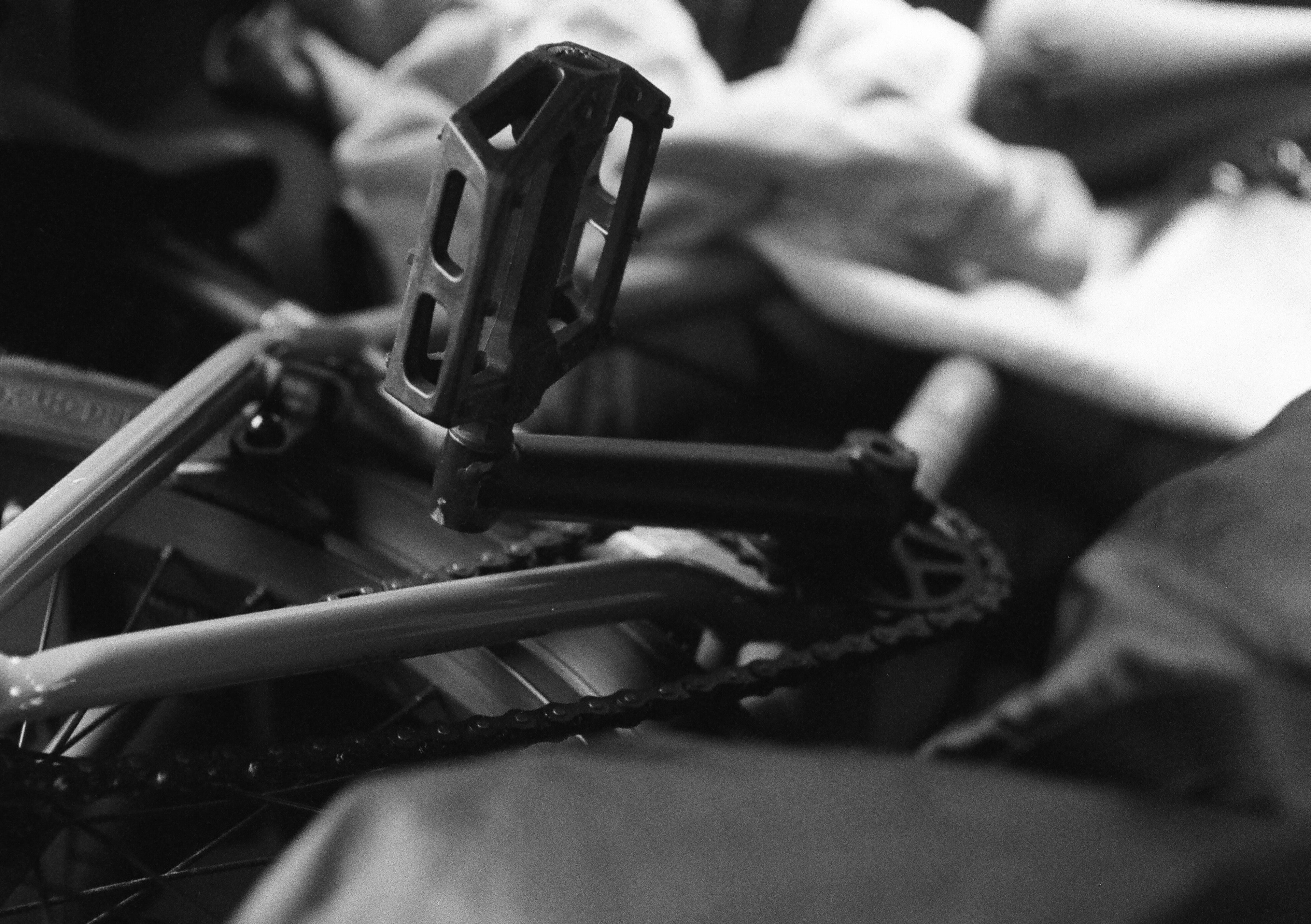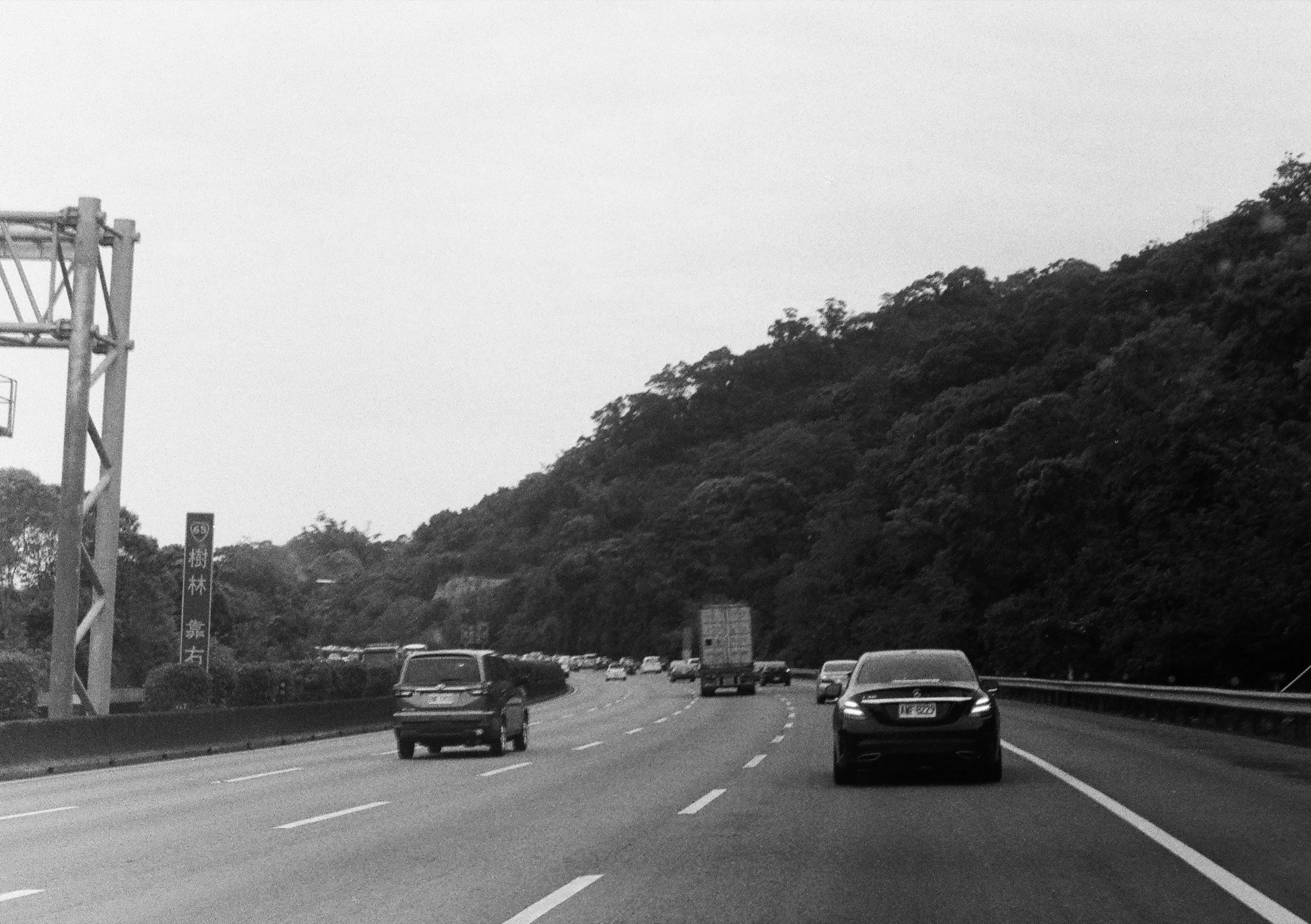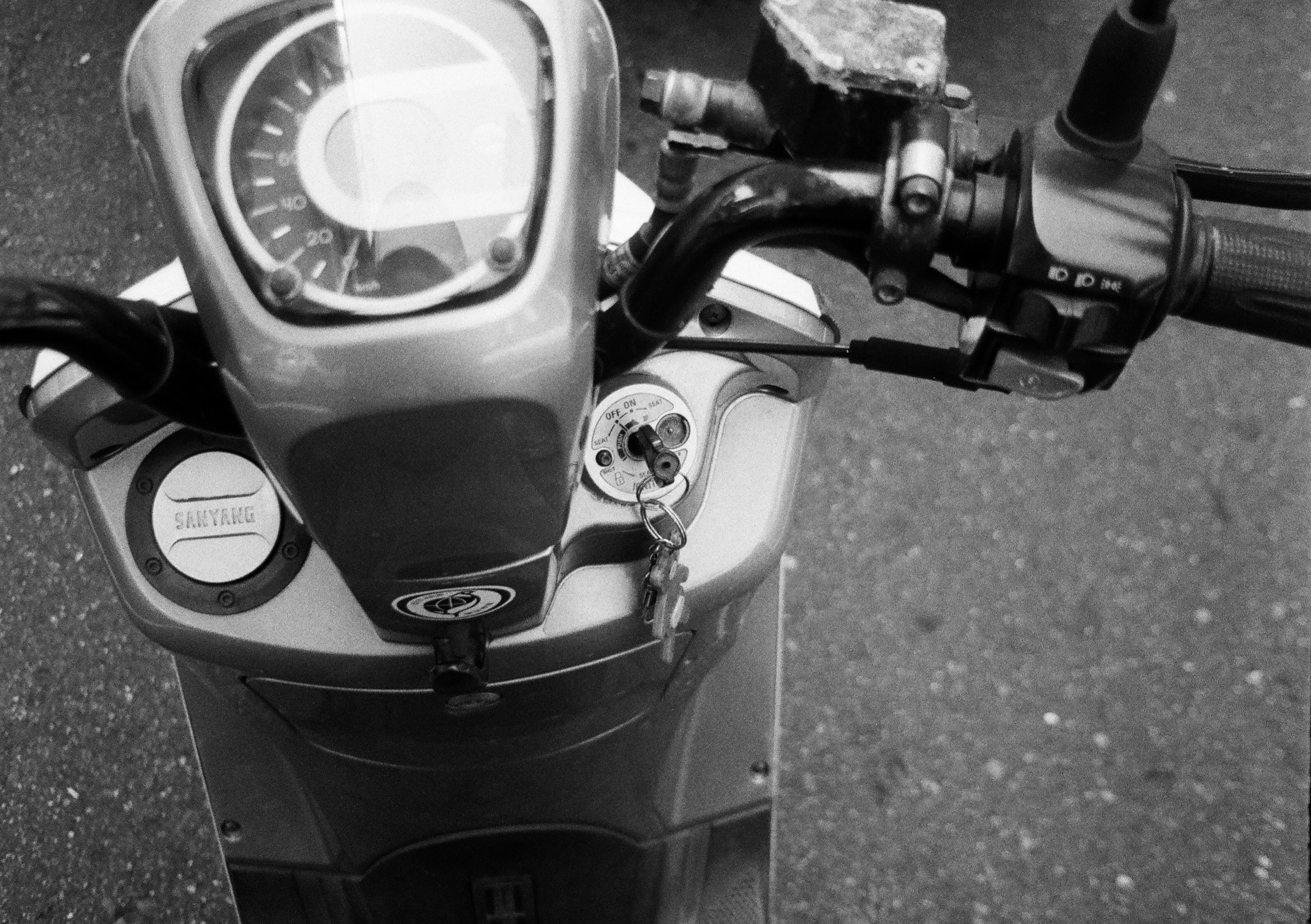這張照片實際上是 +1.5 EV,Ilford Delta 400 雖然對過曝的寬容度沒有比 Ilford HP5 Plus 400 來得好,不過對於欠曝的寬容度確實一流的,是就我所知的黑白底片中表現最好的。我之所以會在這卷 Pen F 搭配使用 Ilford Delta 400,是因為我用的這顆輕量化 25mm f4 鏡頭的最大光圈偏小,我擔心它的低光表現,因此才特別選擇 Delta 400 來使用,如此一來,我在光源不足時,也可以放心的使用 1/30 安全快門進行拍攝。這張照片是我騎我媽的機車到處跑的視角。