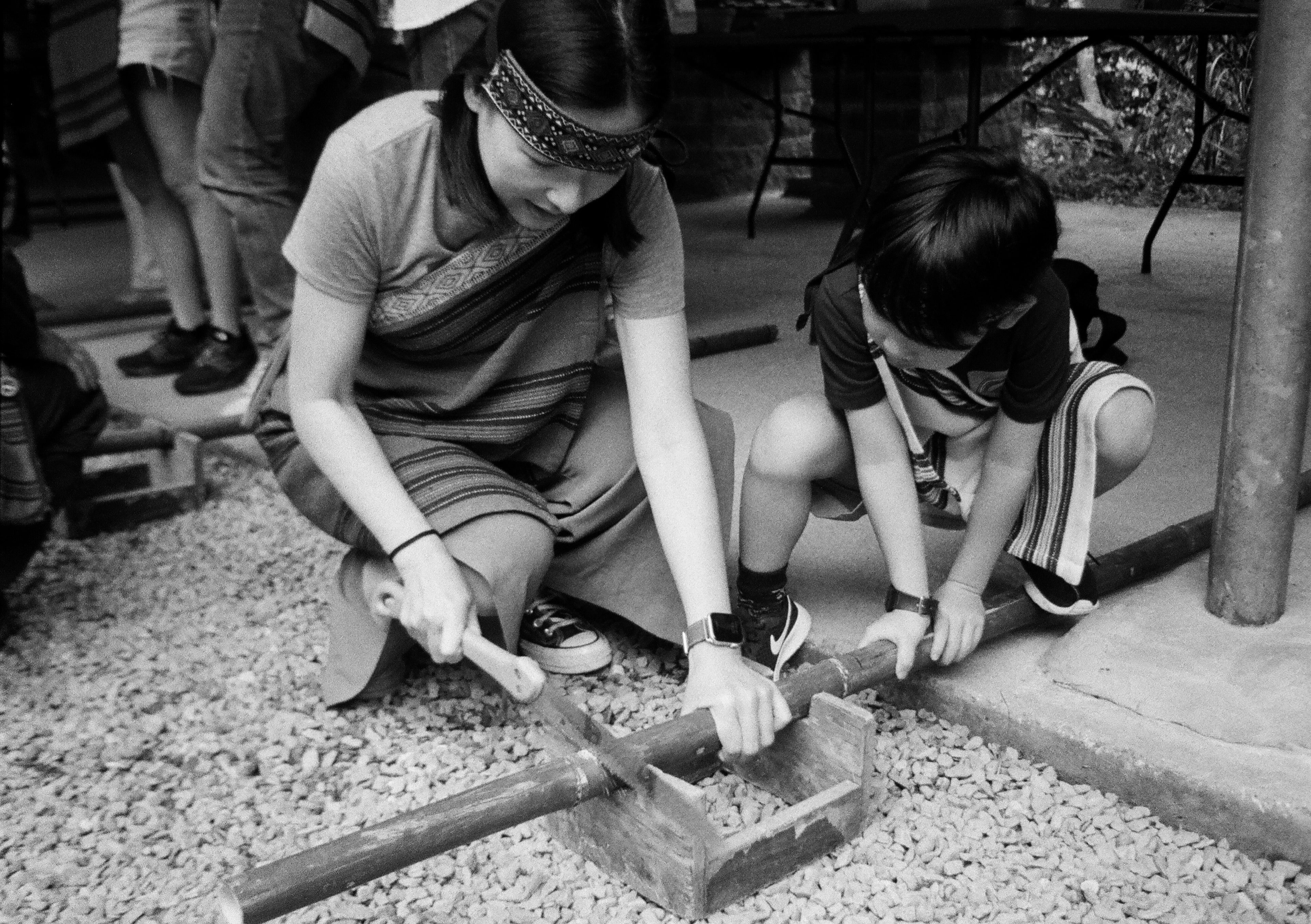 今天兒子班上有原住民文化的體驗活動,我們正在製作竹筒飯。照片中正在鋸竹子的小姐是我太太,在一旁扶著竹子的小男生是我兒子。