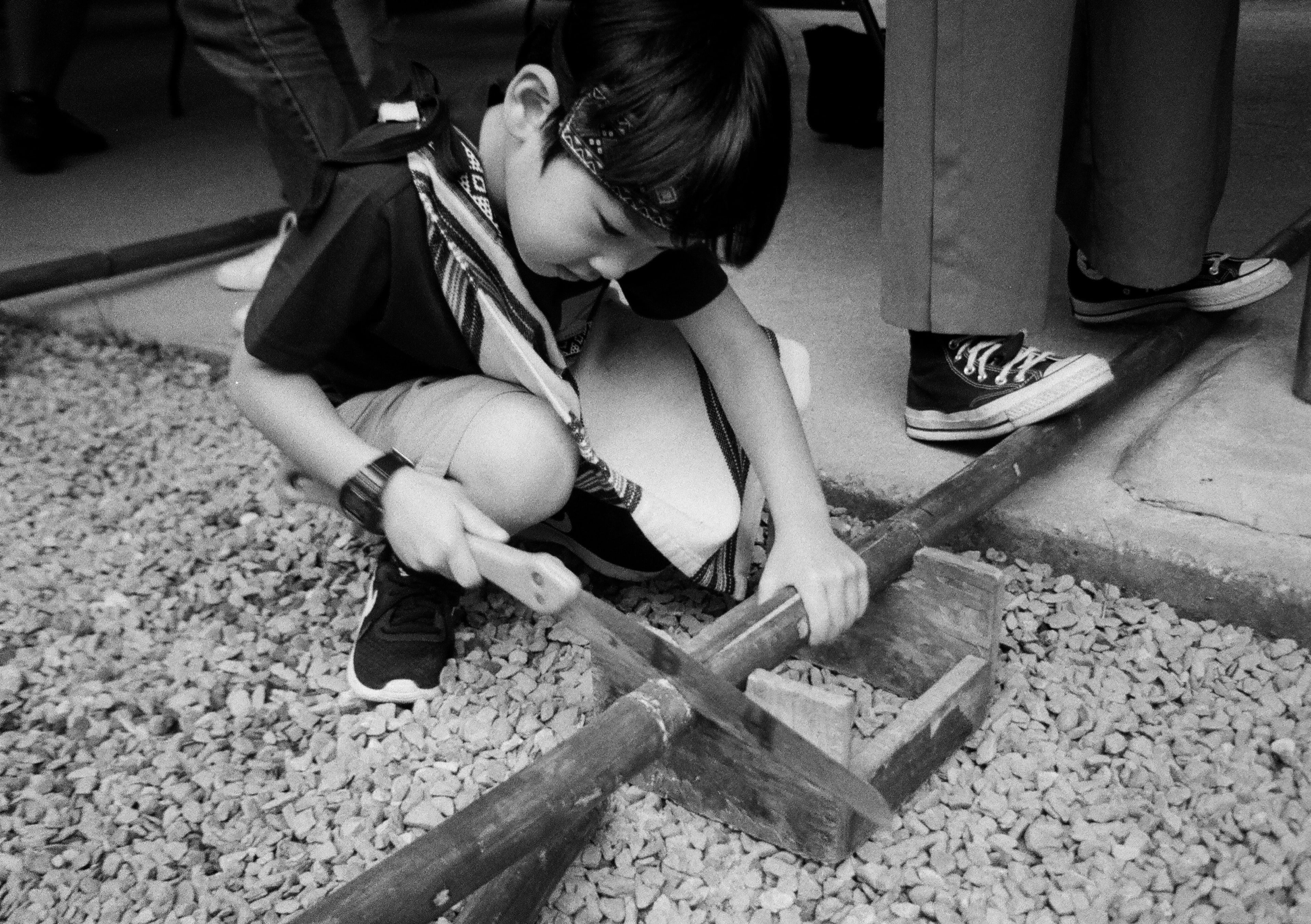 輪到兒子自己鋸竹子,好險我們之前在家裡玩過木工,拿鋸子還算熟悉。