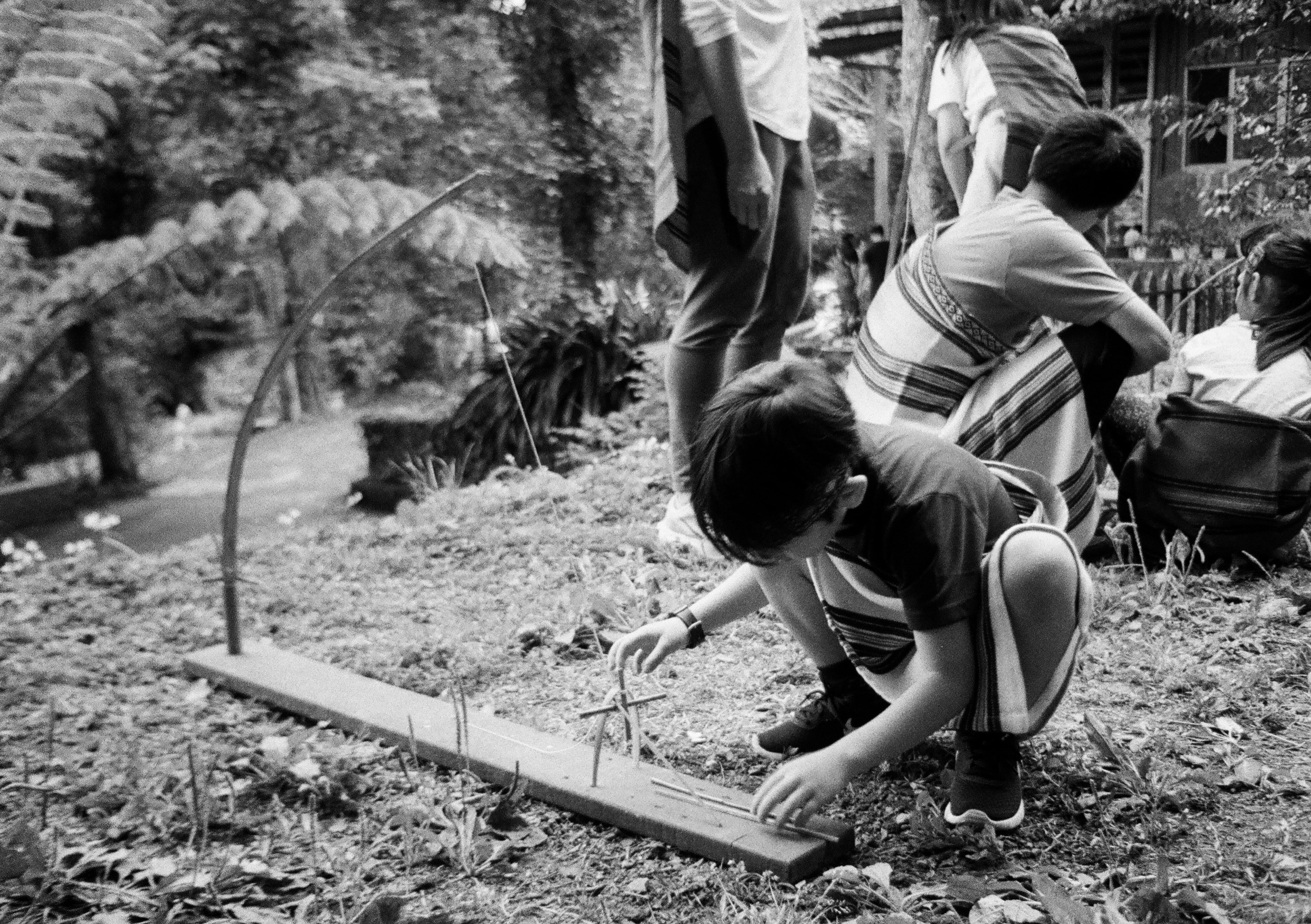 這顆 25mm f4 在 f4 光圈全開時,如果是中距離的話,還是可以拍出一定程度的畫面層次感,因為整個畫面會同時容納清楚和模糊的元素,可以輕易辨認出畫面的主題或重點在哪裡。這張照片,是我們在參觀操作泰雅族的傳統狩獵陷阱,這是一個可以抓竹雞的裝置。
