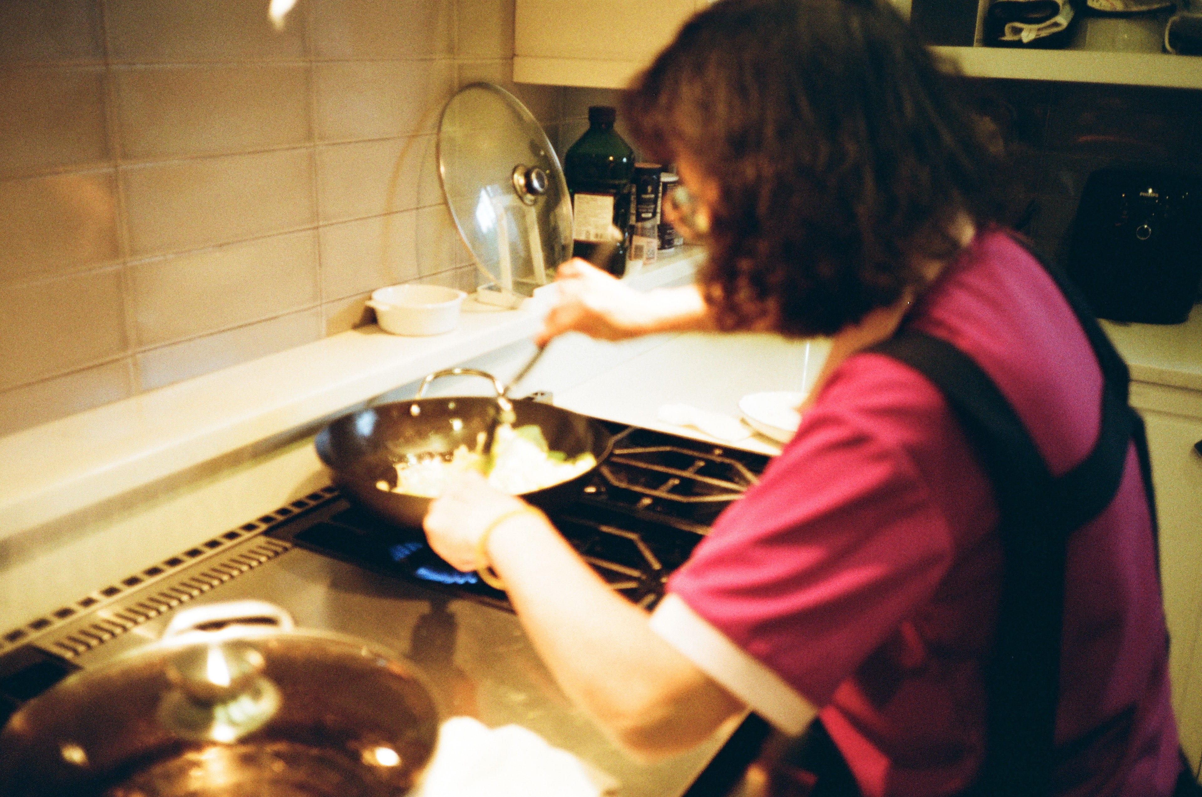 正在煮菜的我媽。不知道你有沒有發現,這個爐台很高,因為這是美國當地一般人使用爐台尺寸,亞洲人通常使用都會有「吊手」的問題,但沒辦法。